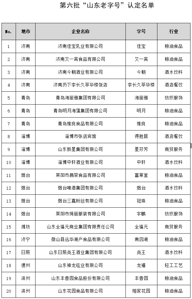為推動我省老字號創(chuàng)新發(fā)展,培育壯大老字號隊(duì)伍,健全我省老字號保護(hù)、傳承、創(chuàng)新、發(fā)展四個體系,根據(jù)《山東老字號認(rèn)定及保護(hù)促進(jìn)辦法》和《山東老字號認(rèn)定通則》,省商務(wù)廳會同省直有關(guān)部門及相關(guān)協(xié)會、專家、企業(yè)代表對各市推薦上報的第六批“山東老字號”申報企業(yè)進(jìn)行了嚴(yán)格評審,并將擬認(rèn)定企業(yè)名單面向社會進(jìn)行公示,公示結(jié)果在規(guī)定時間內(nèi)未收到異議。現(xiàn)認(rèn)定濟(jì)南佳寶乳業(yè)有限公司(注冊商標(biāo):佳寶)等20家企業(yè)為第六批“山東老字號”。