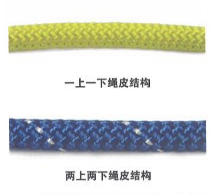 繩皮的設(shè)計(jì)會(huì)對(duì)繩索操作、繩皮滑動(dòng)、耐磨性和繩索的打結(jié)有所影響。繩索制造商會(huì)根據(jù)他們的經(jīng)驗(yàn)選擇繩索的股數(shù)和編織方式,以便制造出性能最佳的繩索。例如,對(duì)于繩皮是48股線的繩索來(lái)講,制造商會(huì)說其光滑的繩皮具有較好的耐磨性,而對(duì)于繩皮是16股線的繩索來(lái)講,制造商會(huì)說它粗糙的繩皮具有較大的耐磨性。