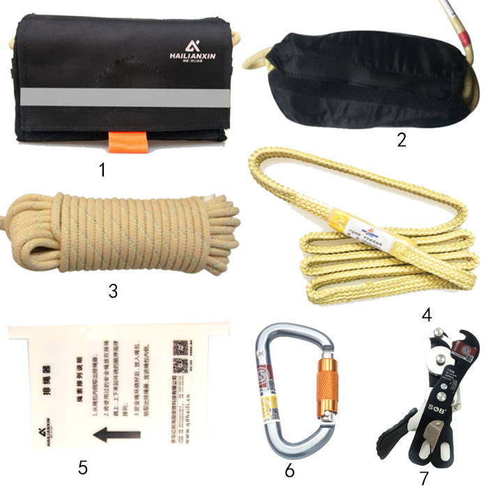 8毫米自救安全繩套裝由多功能繩包、8mm耐高溫自救安全繩16m、輕型安全鉤、可調(diào)節(jié)下降器一個、6.8mm中空連接扁繩一條和排繩器一個組成。