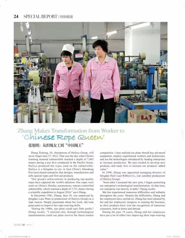 “業(yè)精于勤,荒于嬉;行成于思,毀于隨”,用在張旭明身上最貼切。36年的光陰,張旭明毫不吝嗇的奉獻(xiàn)給海麗雅,從織繩女工到“中國(guó)繩王”,這背后砥礪前行的痛楚也只有她自己最清楚。但是,路漫漫其修遠(yuǎn)兮,張旭明會(huì)一直秉持“大國(guó)匠心”的理念,將繩纜產(chǎn)業(yè)做到極致,要讓自己的繩纜走出國(guó)門,站在世界的舞臺(tái)上,為國(guó)爭(zhēng)光!