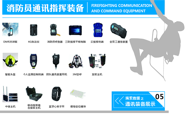 消防員通訊指揮裝備:DMR對講版,4G執(zhí)法儀,消防員呼救器,三防指揮平板電腦,云指揮終端,全雙工通信裝置,智能頭盔,個人監(jiān)測控制終端,團(tuán)隊(duì)通訊裝置耳機(jī),3M空呼,發(fā)射主機(jī),中繼主機(jī),移動指揮箱含接收主機(jī),藍(lán)牙心率手環(huán),慣導(dǎo)定位模塊。