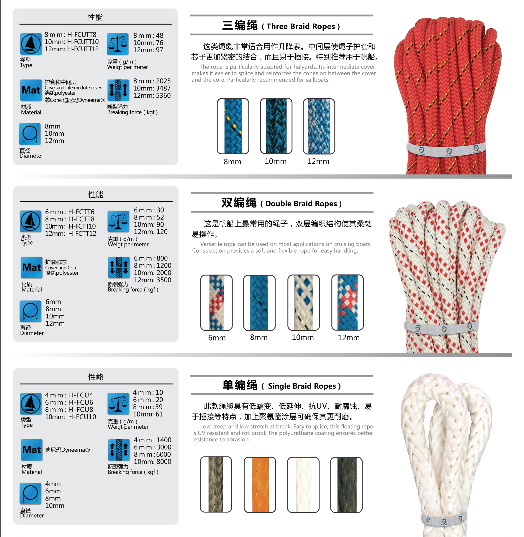 每款帆船繩都經(jīng)過獨(dú)特設(shè)計(jì)及專業(yè)的工藝方法編織而成。根據(jù)客戶需要對(duì)帆船繩進(jìn)行熱(冷)牽伸處理,可獲得適度的柔軟度,超低延伸等效果;加上特殊的涂層處理使得帆船繩表皮更耐磨損,讓操作更加靈活且耐久,加上五彩繽紛的配色被廣泛應(yīng)用于帆船系泊、帆船控帆等領(lǐng)域。